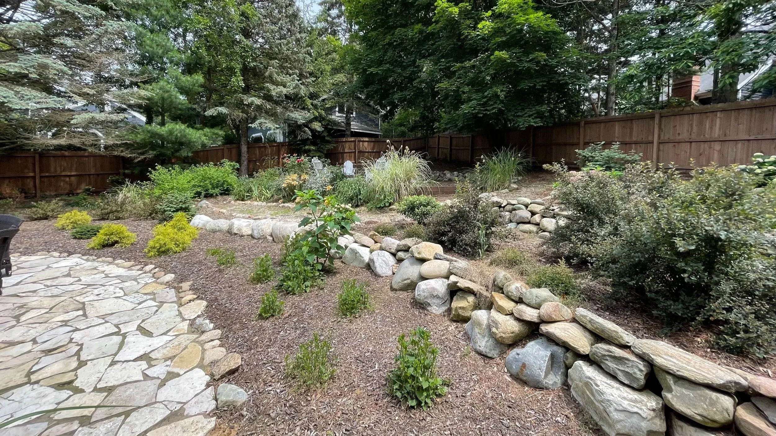 With existing pine and maple trees the property had kind of a summer camp vibe to it and I was intrigued. As the owner led me to the backyard, she explained that they loved the fully fenced space. It felt safe to them and private. Layers of fieldstone walls stepped up a gentle slope. Underfoot irregular flagstone paved out walkways and a patio. I tripped and the client groaned, exclaiming how she hated the uneven stone wanting it gone in the new design. When the conversation turned to a pool her face lit up sharing the dream of her boys playing in the water. She was equally animated describing incorporation of a set of swings which one son was particularly fond of.