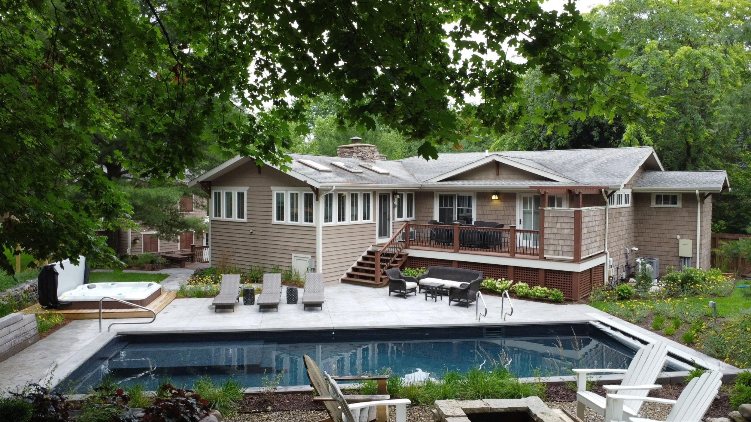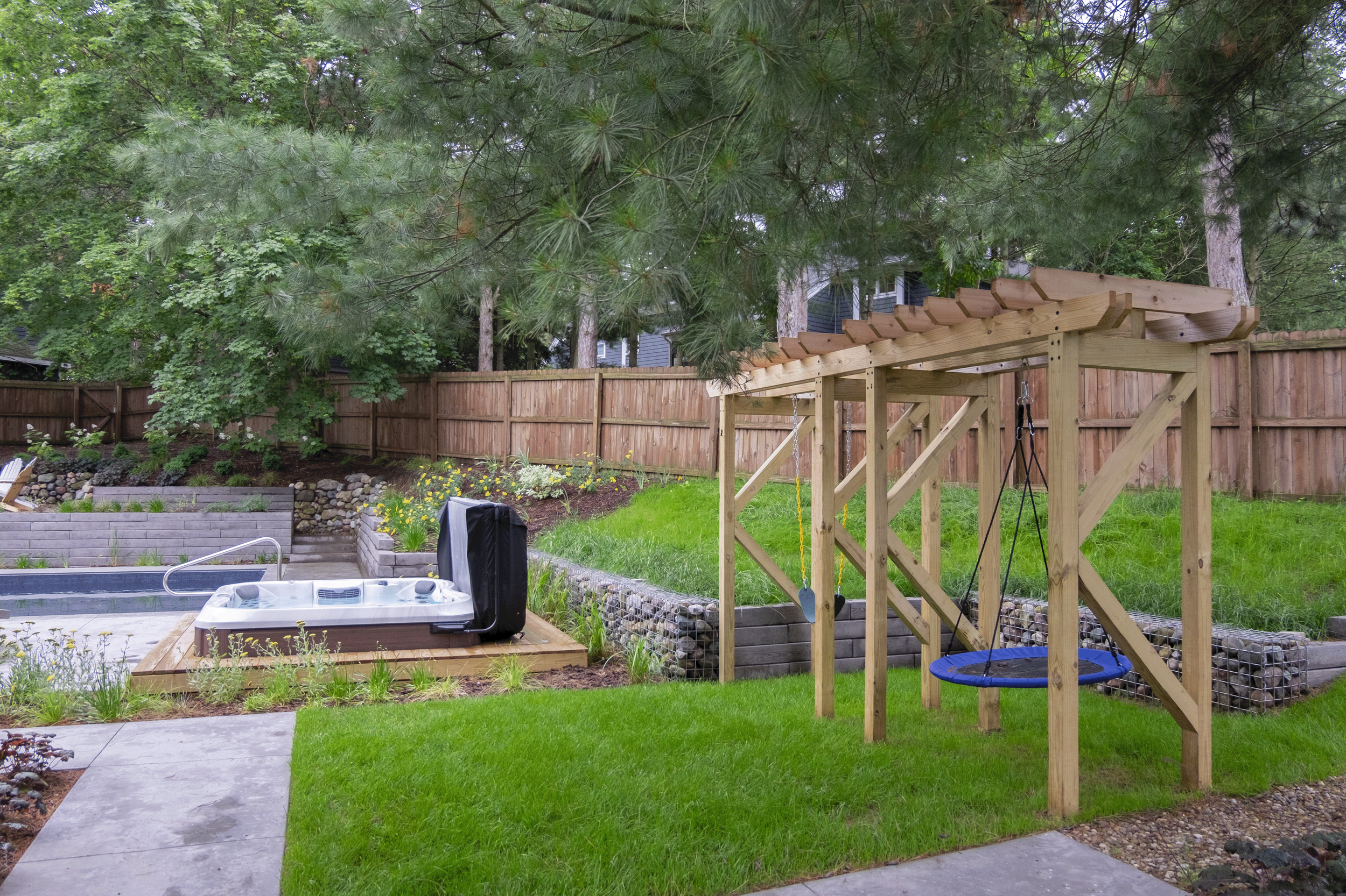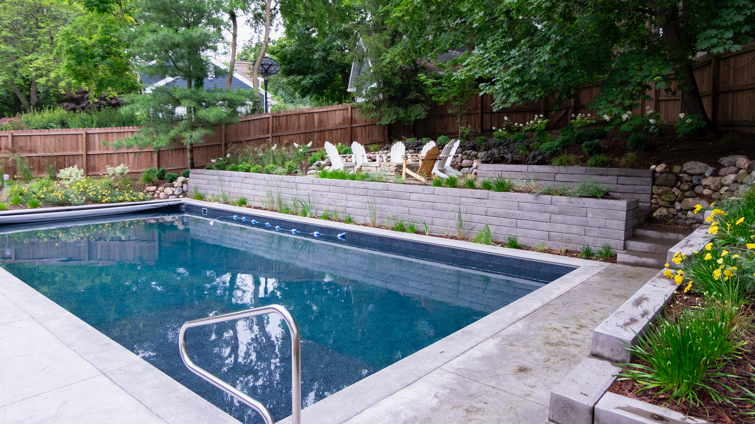 Originally, a fiberglass pool was planned, but due to supply and demand issues from the pandemic, we shifted to a vinyl-liner pool. This allowed us to create a customized pool with features specific to the client’s needs. A small sun ledge and therapy bench were incorporated providing the perfect perches for their boys.